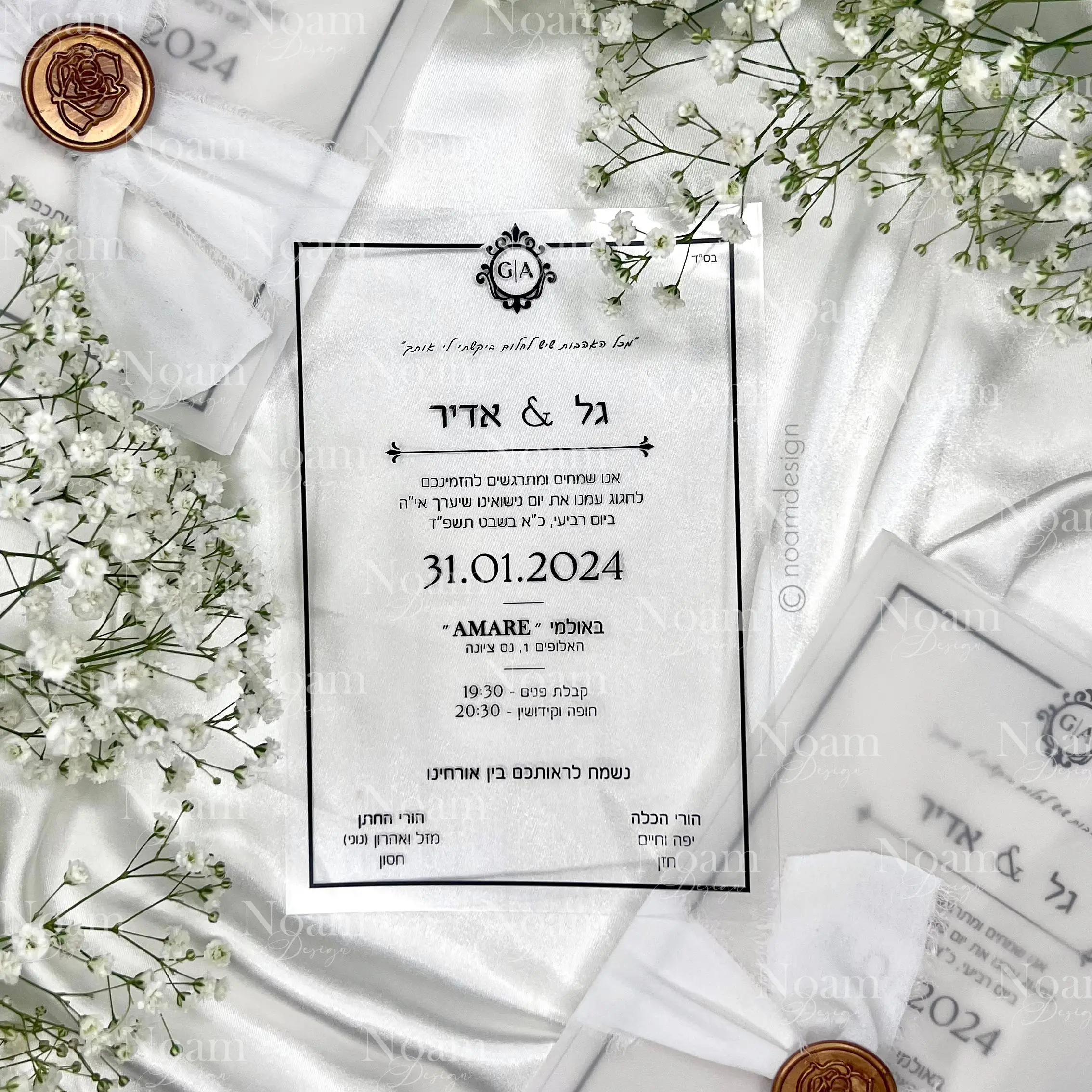 הזמנה חד-צדדית מעוצבת בקפידה, מודפסת על שקף שקוף עבה ואיכותי, מוגשת בתוך מעטפה שקופה יוקרתית עם חותמת שעווה בסגנון וינטאג' בעבודת יד.