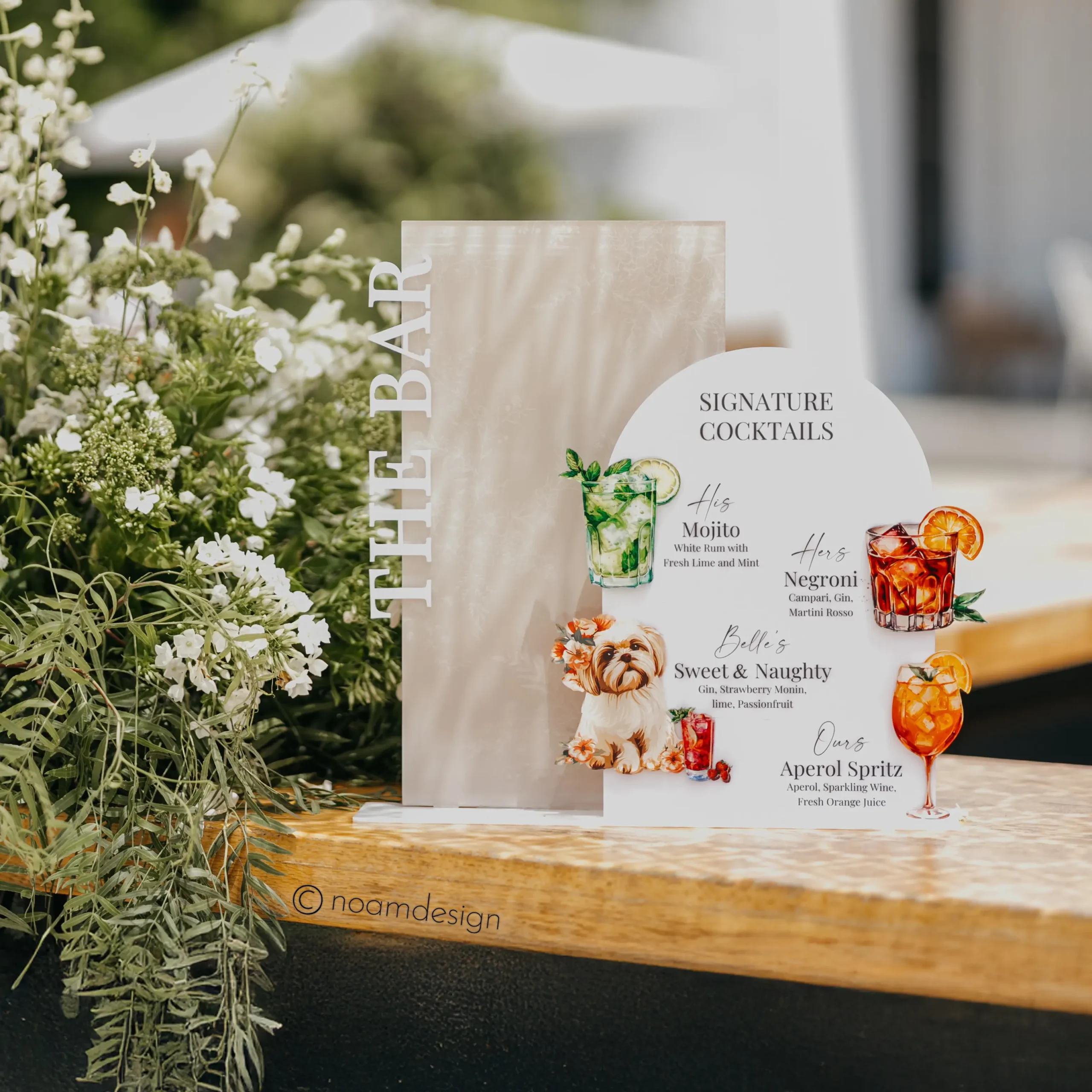 תפריט קוקטיילים בהדפסה על פרספקס כולל חיתוך צורני והדבקה בשכבות, כולל שכבה אחורית ושכבה קדמית, עיצוב בהתאמה אישית מלאה - כולל איורים.