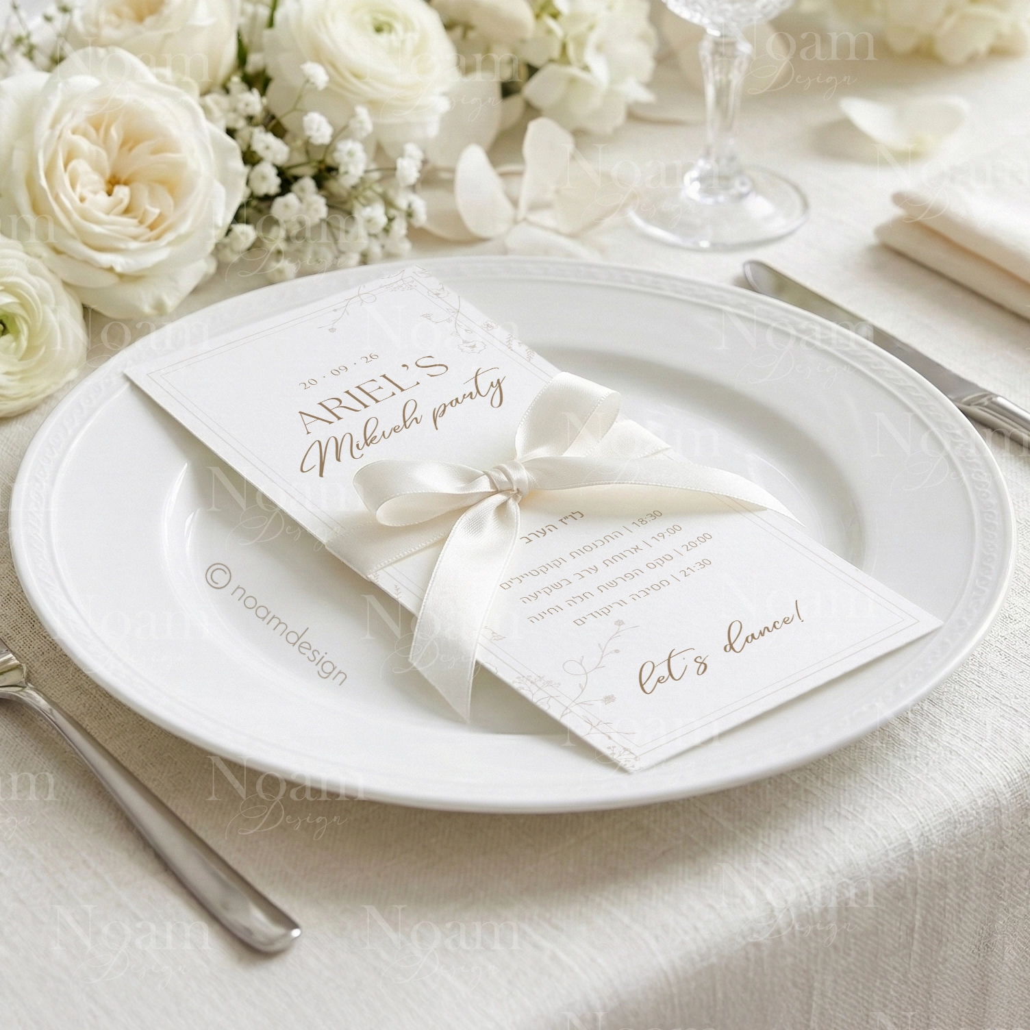 מיתוג אישי לכל צלחת בהדפסה על נייר טקסטורה יוקרתי, כולל סרט סאטן עם פפיון.
