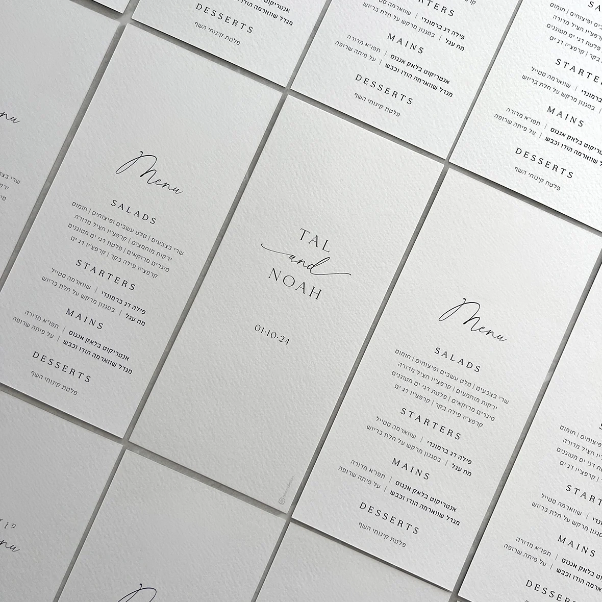 תפריטים מודפסים בגודל 22×10 ס"מ, מעוצבים בהתאמה אישית.