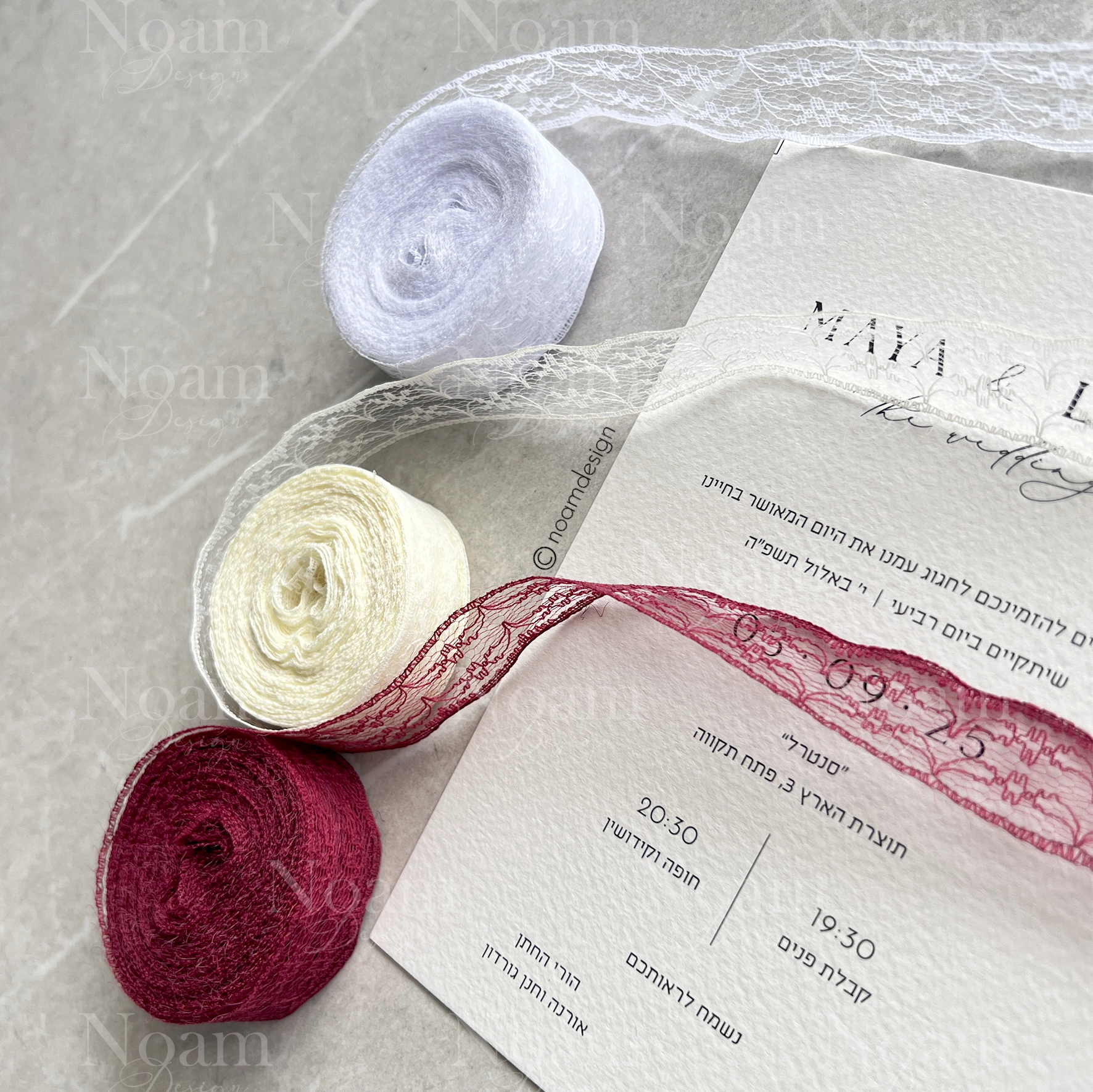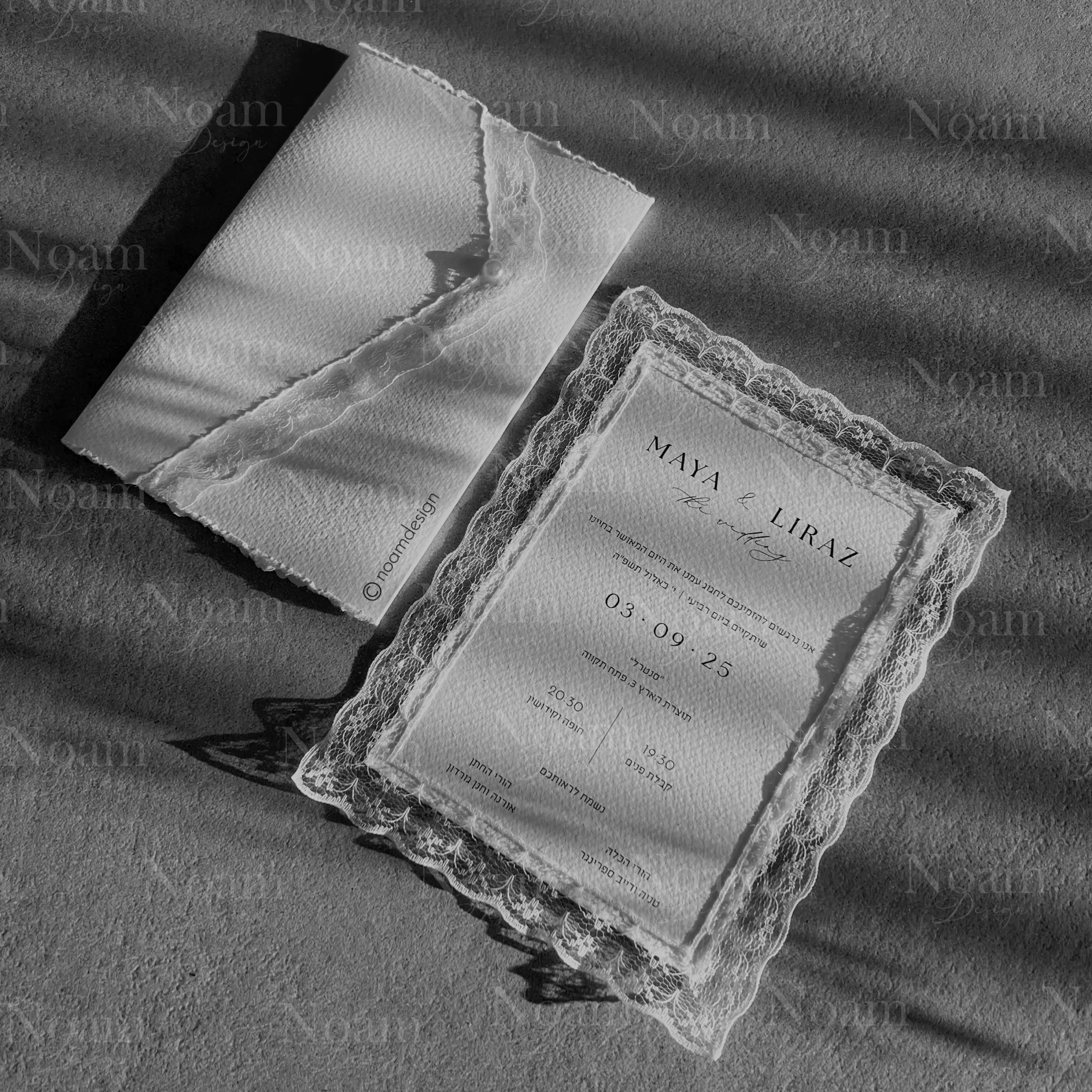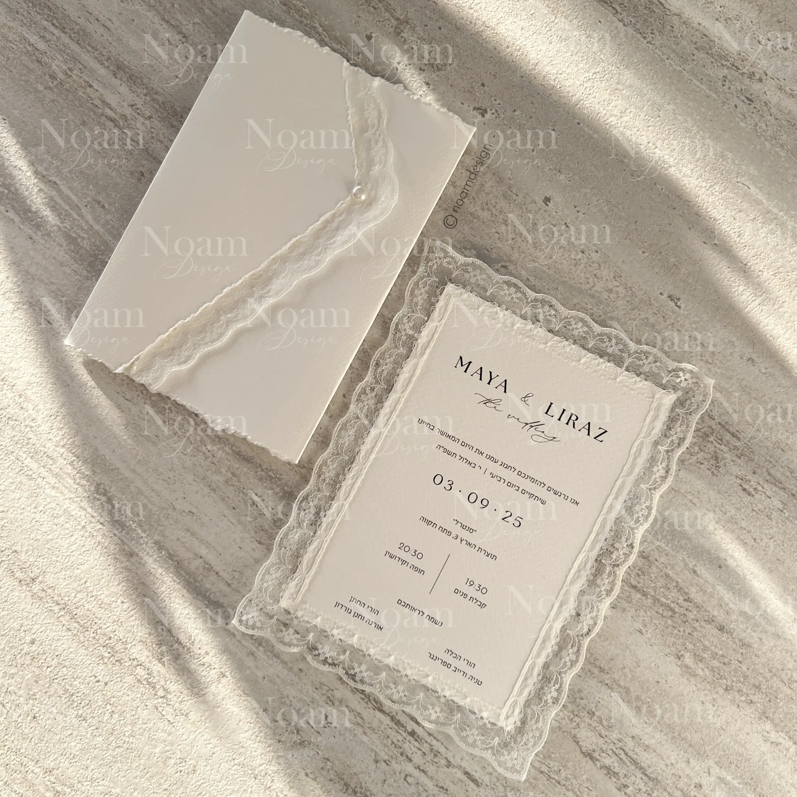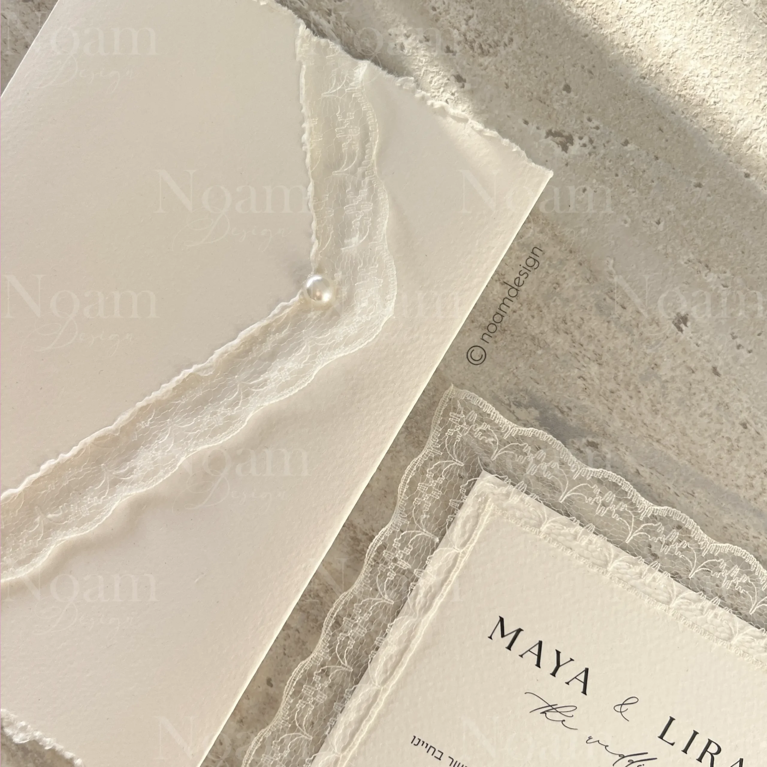 Proud to present our Premium Lace Invitation – a handmade piece of art featuring delicate lace, a custom-designed envelope with hand-torn edges, and a pearl carefully attached by hand.