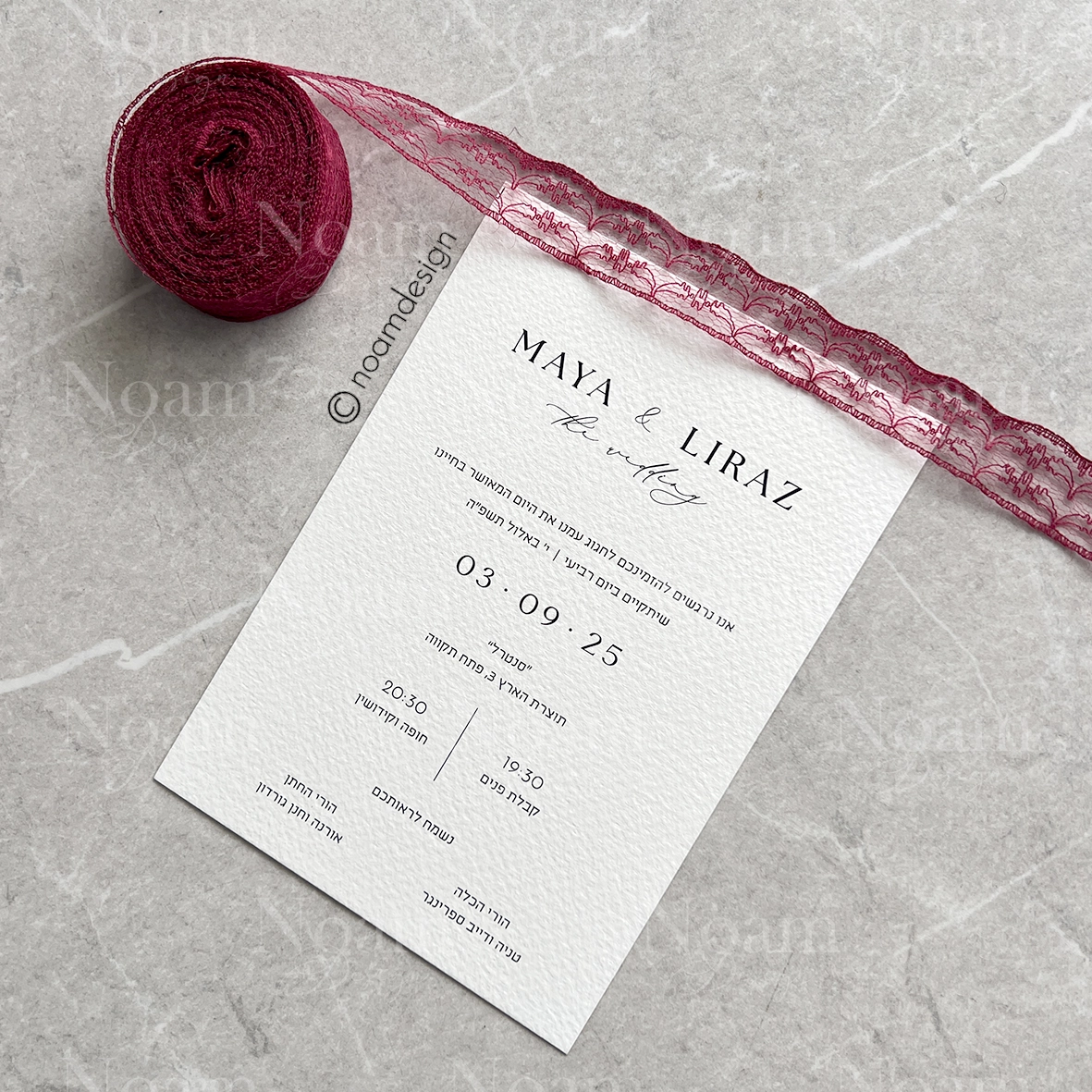 Printed on a textured rectangular card (17×12 cm) including lace and a matching handmade envelope.