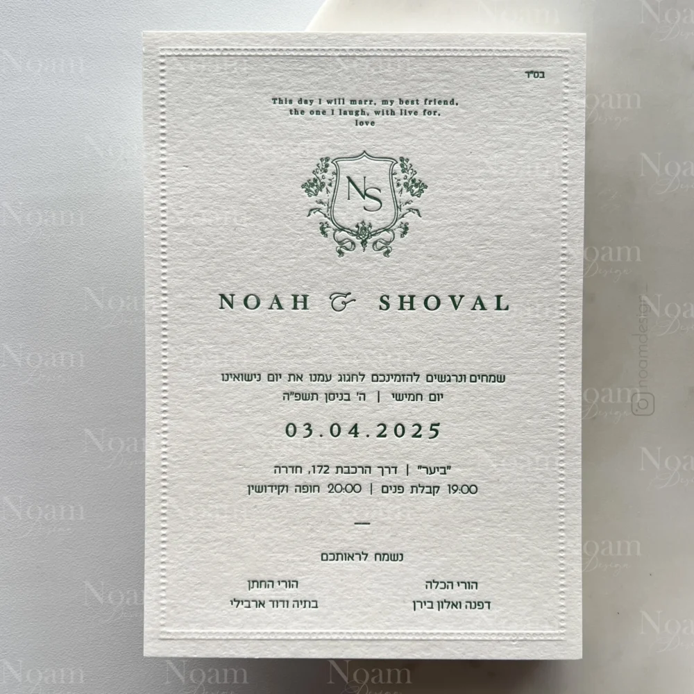 The special feature of these invitations is that the entire text and design are pressed into the paper using this method — not just the logo. The frame can be ink-pressed in color or left blind (without color) for an elegant embossed look.