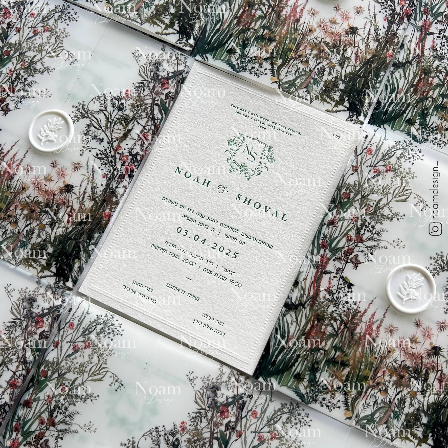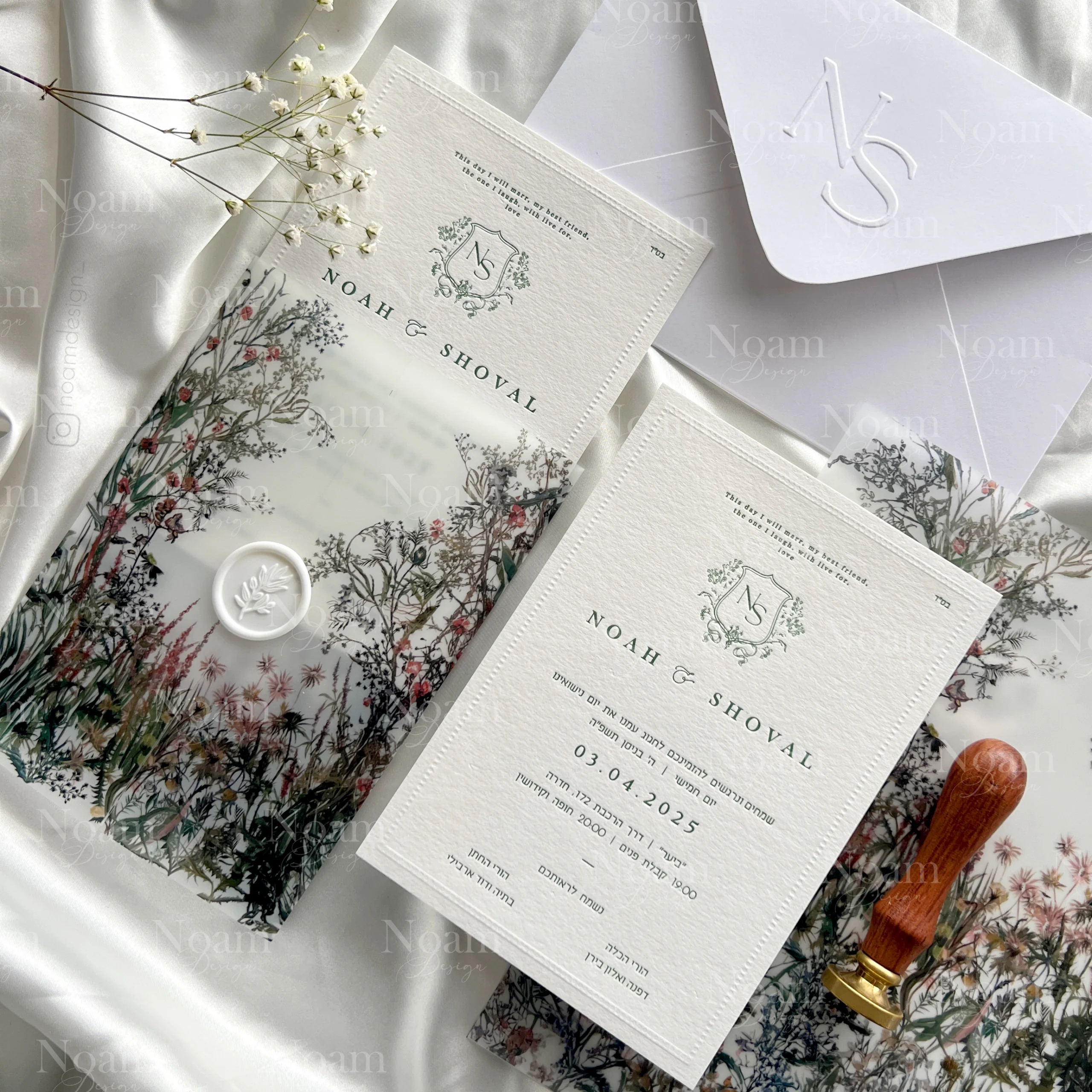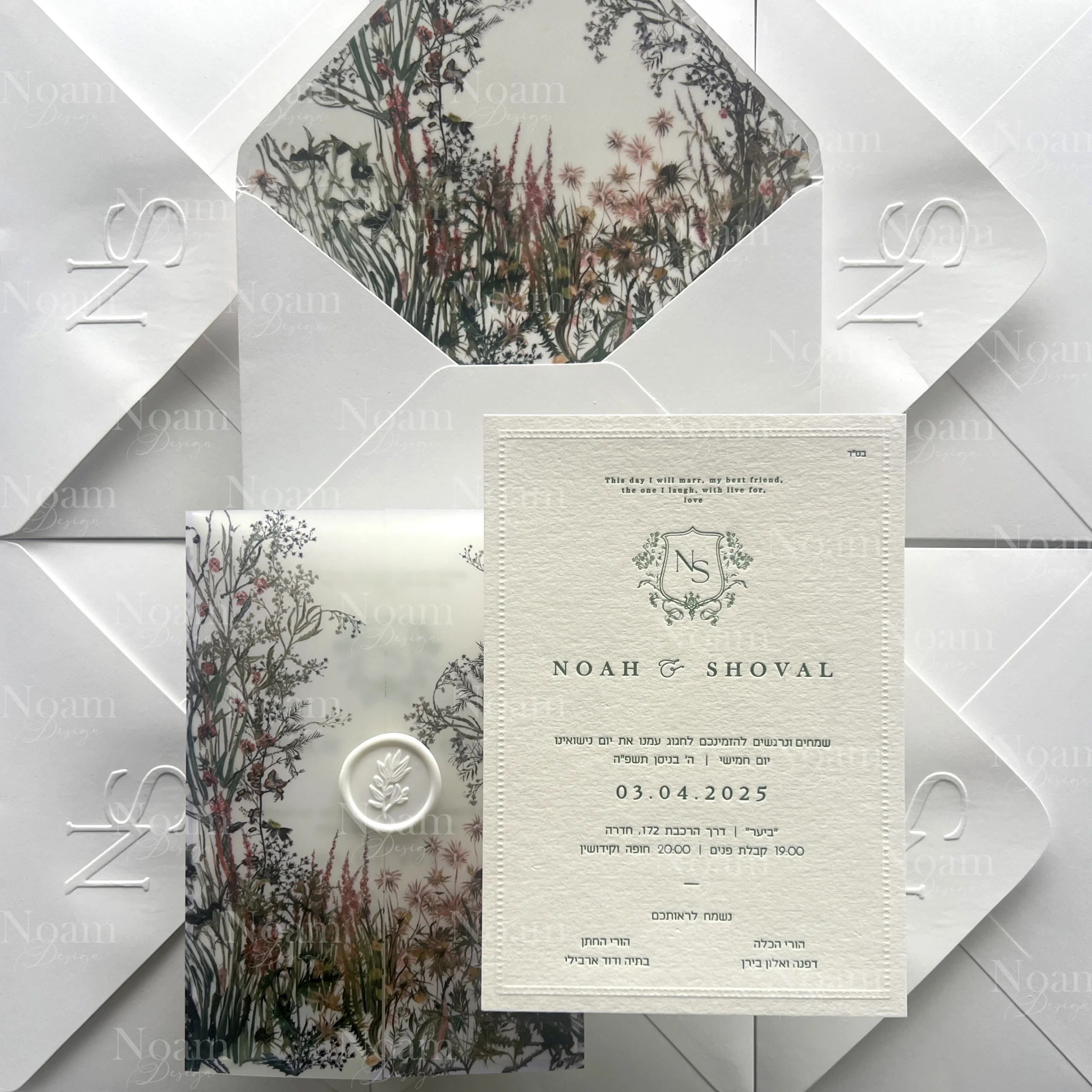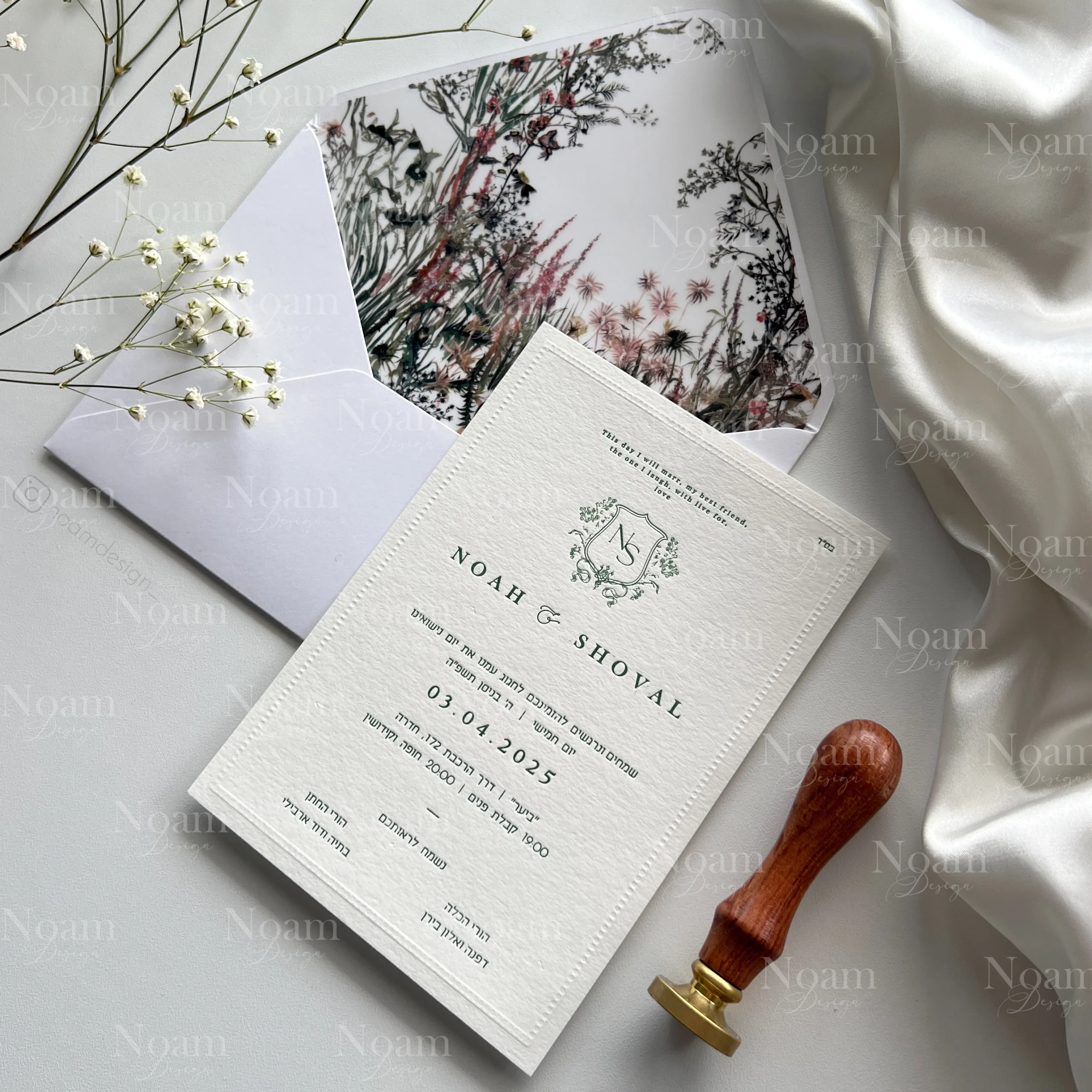 Our package includes luxurious ink-pressed invitations, personally designed for you. Each invitation comes with a matching envelope. You can add a custom print — choose from our existing designs or request a fully personalized pattern in your preferred style and color palette.