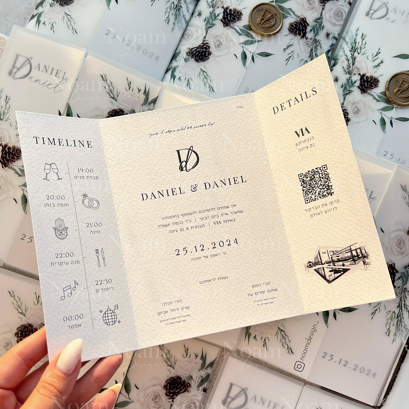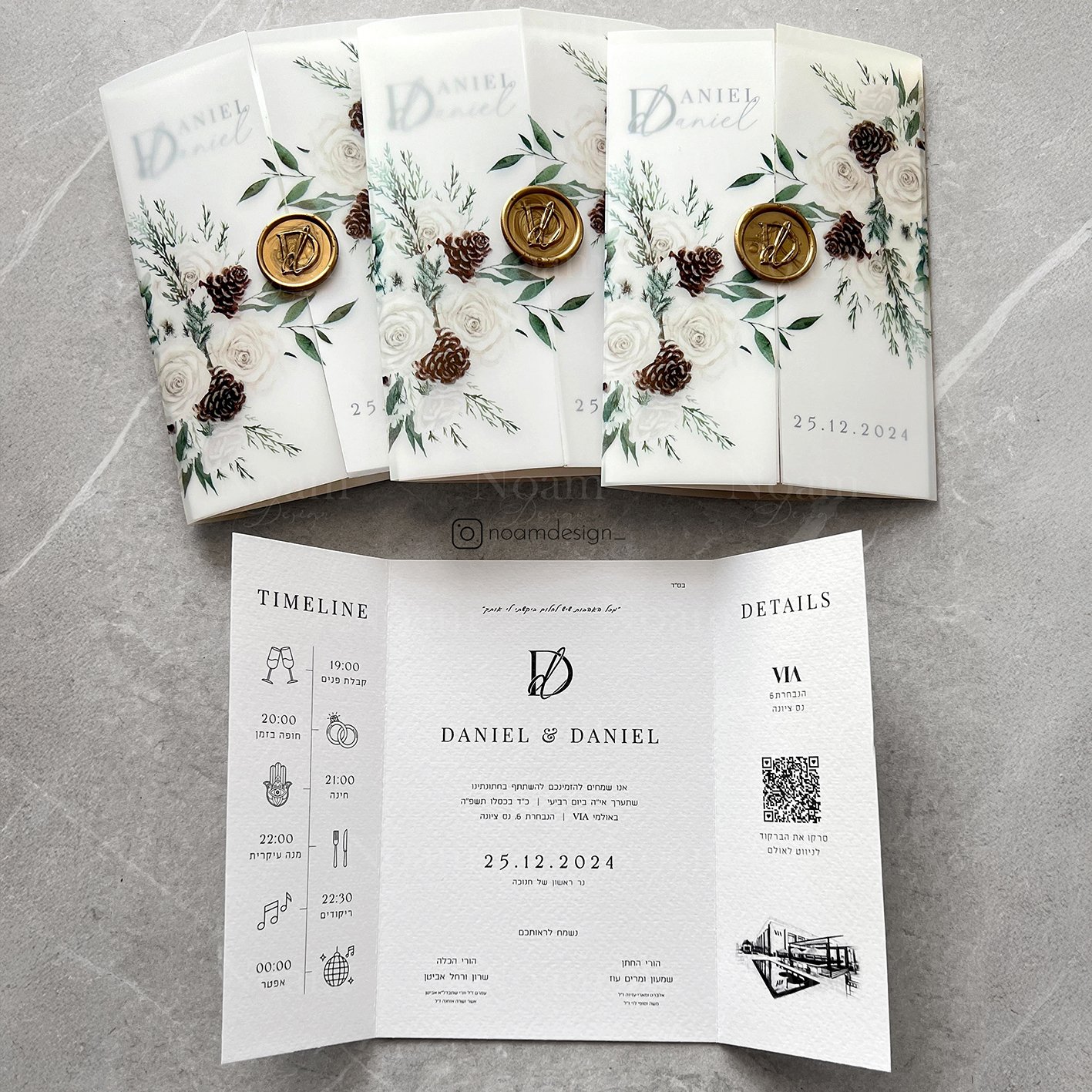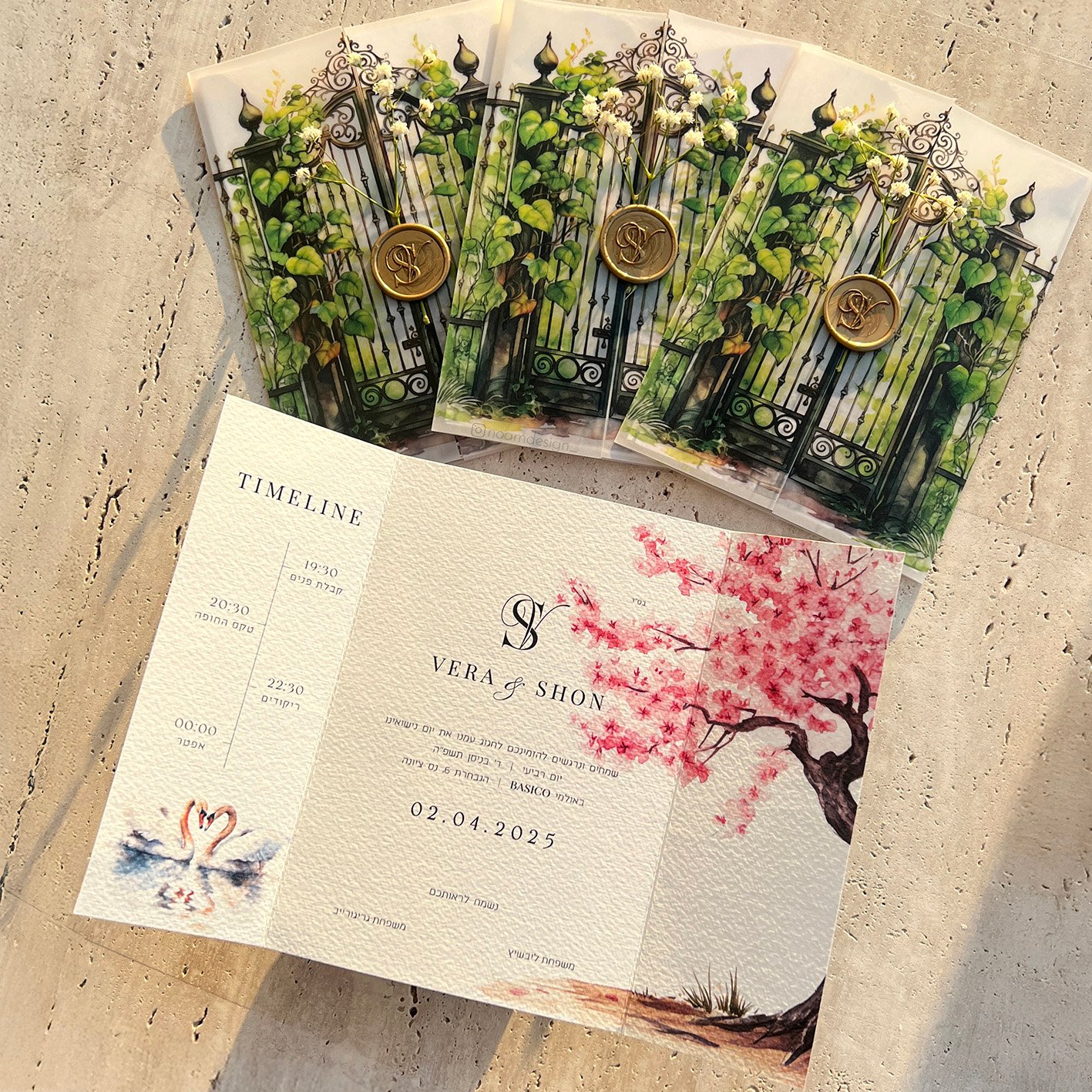 A meticulously designed folding invitation, presented in a luxurious transparent envelope sealed with a handcrafted vintage-style wax seal.