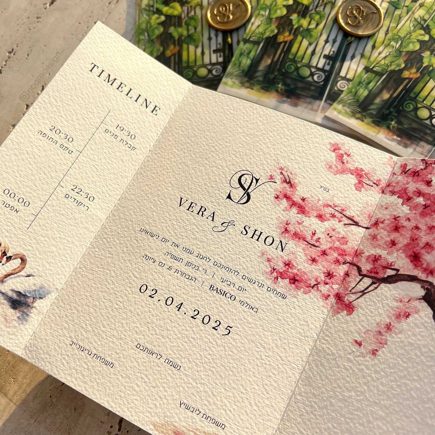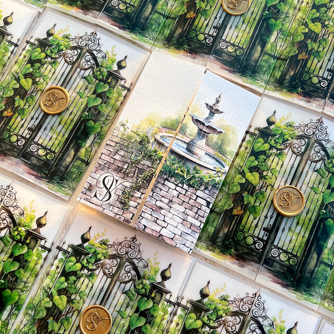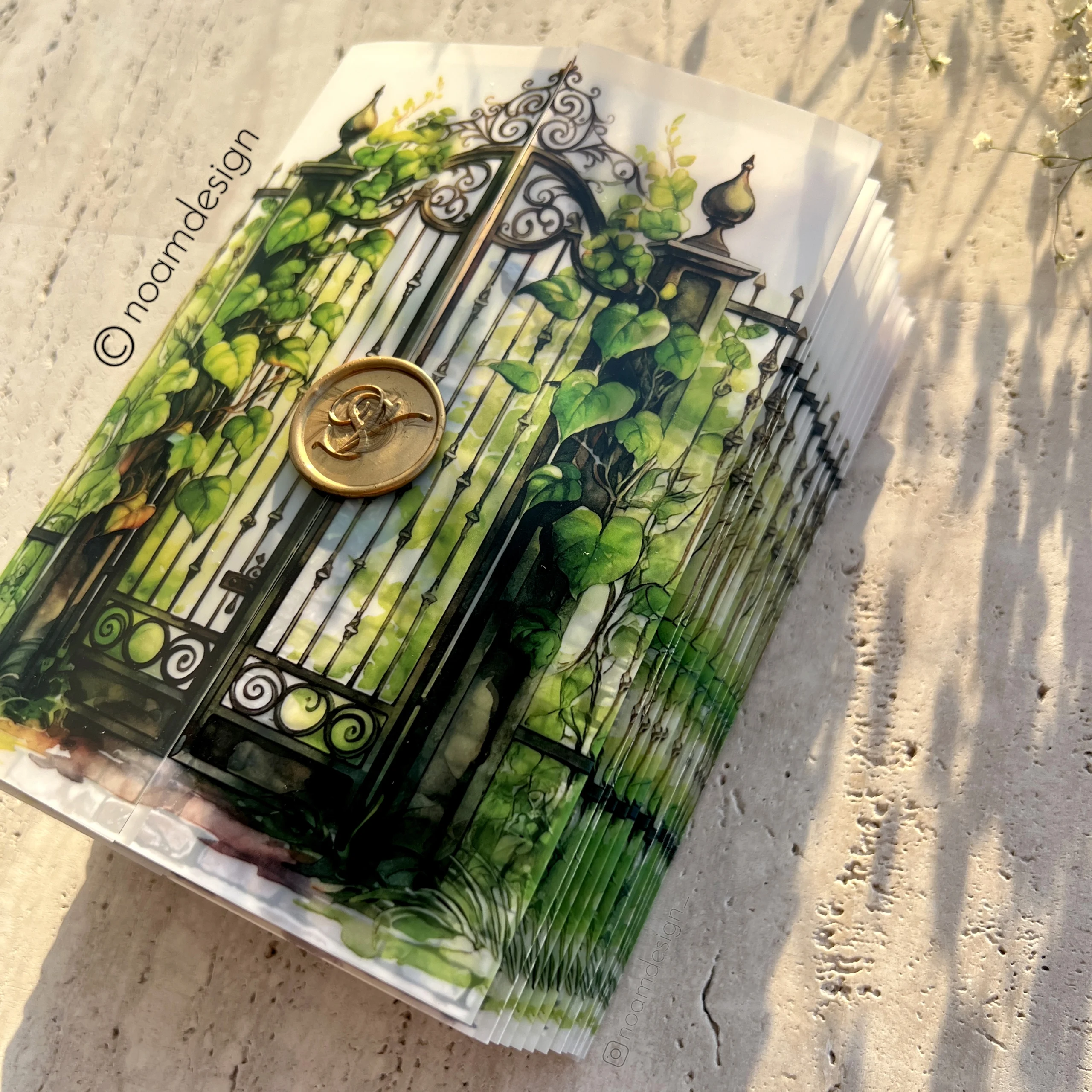 A meticulously designed folding invitation, presented in a luxurious transparent envelope sealed with a handcrafted vintage-style wax seal.